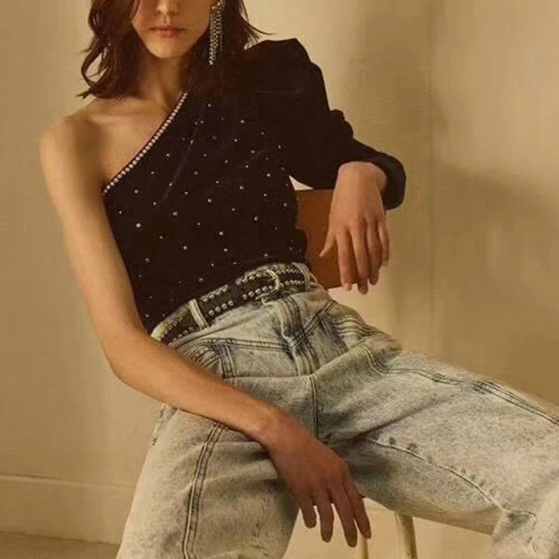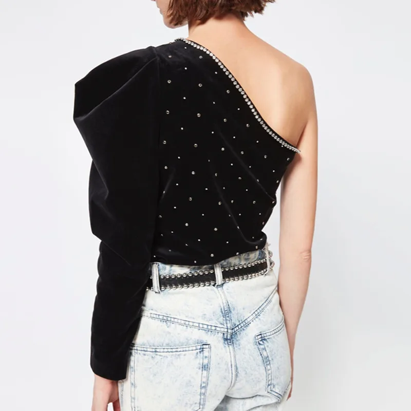 Mega Deal TWOTWINSTYLE Diamonds Velour T-shirts For Female Skew Collar Puff Long Sleeve Autumn T Shirt Women