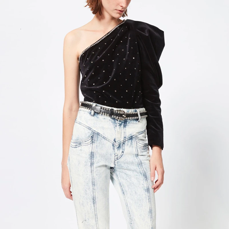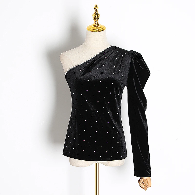 This item is next has features of TWOTWINSTYLE Diamonds Velour T-shirts For Female Skew Collar Puff Long Sleeve Autumn T Shirt Women .